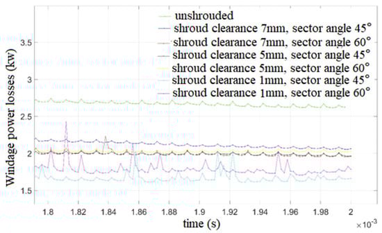 Figure 12 shows the curve of the windage power loss of SBGP varying with time. Existing research data show that the windage power loss can be reduced by 70% to 75% after the windshield is installed []. The windshield with the best effect in the simulation (the clearance is 1mm, the engagement opening is 30°) can reduce 55.3% of the windage power loss. At this time, from the perspective of actual installation, it is no longer possible to further reduce the windage loss by reducing the clearance between the windshield and the gear.