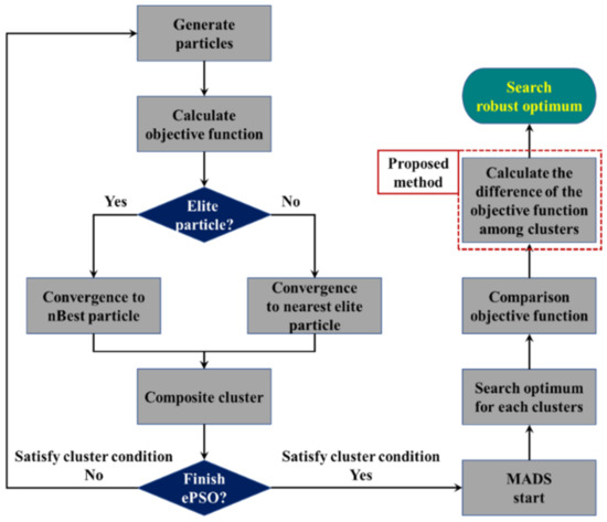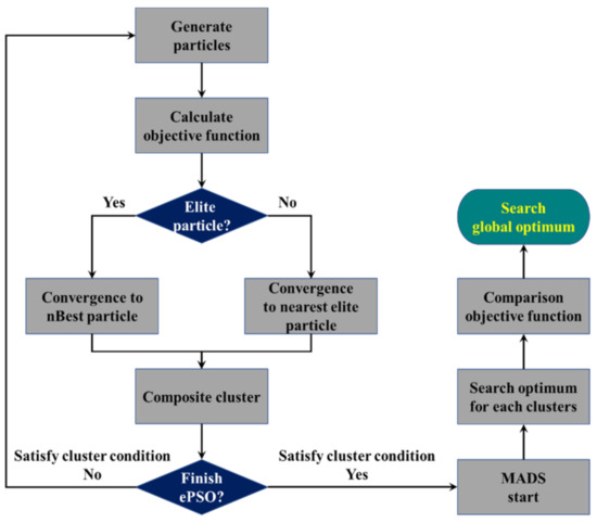 where nBest represents the neighboring best point, which is different from pBest as used in conventional PSO. When nBest is determined, the other neighboring particles update their velocity and direction and converge to this nBest position. The converged nBest positions are identified as clusters, and MADS is used for an exploitative search of the clusters. The flowchart of ePSO is presented in Figure 1 [11].