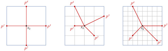 where Mk and pk denote the mesh and frame in the k-th iteration, respectively; D is a positive spanning set; NnD is the number of search directions; Sk is the set of points where the cost function is evaluated at the k-th iteration; d is the frame direction in the k-th positive spanning set Dk; is the mesh size parameter, which scales D to expand or contract depending on the success or failure of previous searches [13]. Examples of MADS reference frames are shown in Figure 2.