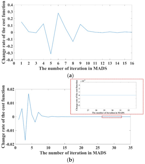 The proposed novel algorithm is named robust explorative particle swarm optimization (RePSO), and it is based on the mechanism of ePSO. The proposed algorithm offers two advantages: high search speed and the ability to search for robust optimal solutions. RePSO is a method that ensures robustness, calculates the rate of change of the cost function in the MADS stage on ePSO, and determines the robustness by analyzing the trend of the rate of change of the cost function. As shown in Figure 3, when the rate of change of the cost function is low, the curve of the cost function tends to be gradual. In contrast, when the rate of change is high, the curve of the cost function tends to be steep.