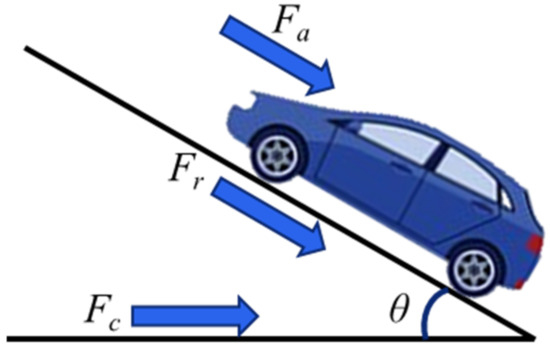 The driving performance of a vehicle was simulated to derive the performance specifications of the target traction motor. The simulation was performed based on the equations listed below, and the relationship between the vehicle and each driving load is illustrated in Figure 7.