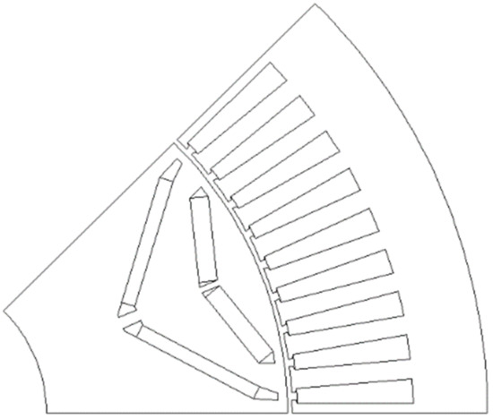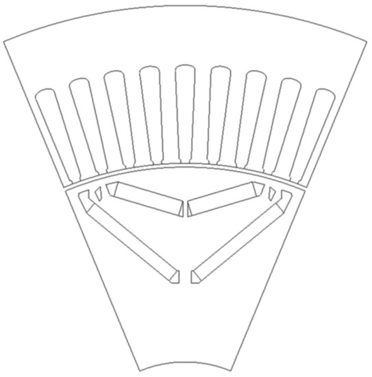 As the traction motor of an EV uses a reducer, the high-speed operation of the traction motor is required to satisfy the maximum speed of the vehicle. Therefore, an interior permanent magnet synchronous machine (IPMSM) was employed as the traction motor. The number of poles was set as eight considering the inverter switching frequency; 72 slots were chosen, which is the maximum number of slots that can be manufactured. The topology of the base model is depicted in Figure 10 [17].