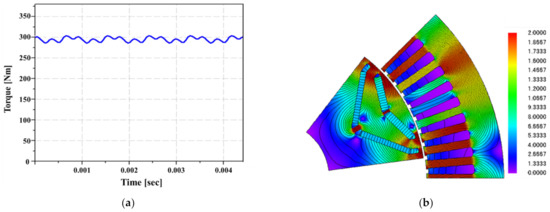 The target specifications, average torque, and torque ripple, which causes noise and vibration, were confirmed under the loaded condition. The average torque was found to be 295.33 Nm, which satisfies the target specification, and the torque ripple was 5.93%. The torque waveform and the contour of magnetic flux density are presented in Figure 12.