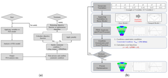 The flowchart of optimal design with optimization algorithm and FEM: (a) flow chart of optimization with optimization algorithm; (b) flow chart of traction motor optimization with FEM.