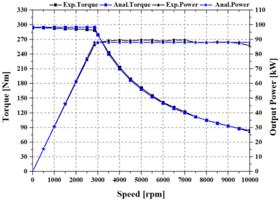Next, an experiment was conducted to evaluate the performance of the motor. The motor performance was verified by comparing the T–N curves obtained using analytical and experimental data. A comparison of the T–N curves is presented in Figure 21. Based on this comparison, it was found that the analytical and experimental data were well matched.
