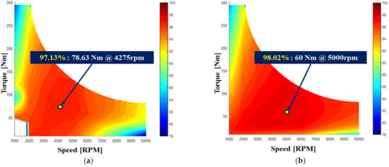 Finally, the efficiency of the motor was evaluated. In this test, an efficiency map was prepared using the efficiency data for each operating point, and these efficiency maps were subsequently compared. The maximum efficiency point of the experimental data was 78.63 Nm at 4275 rpm; the efficiency at this point was 97.13%. Moreover, the maximum efficiency point of the analytical data was 60 Nm at 5000 rpm; the efficiency at this point was 98.02%. A comparison of the efficiency maps is presented in Figure 22.