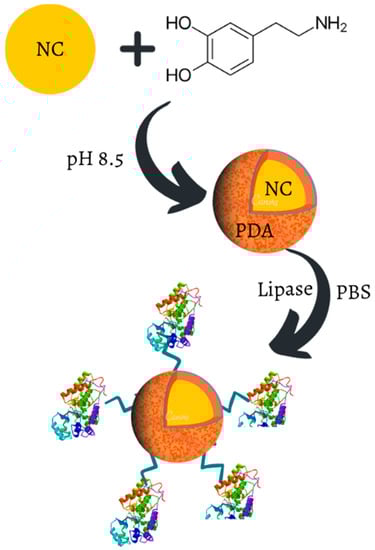 Phosphate buffer solution (40 mL) was mixed with 0.4 g of lipase in a 250 mL flask for each COBO. Next, 40 mL of PDA-coated cerium oxide bismuth oxide nanoparticles suspension was gradually poured into the lipase mixture and stirred at 4 °C for 3 h. The formed nanobiocatalyst was washed with phosphate buffer to eliminate unreacted enzyme and then desiccated at 4 °C. All three NBCs were prepared by the same method (Figure 1) [].