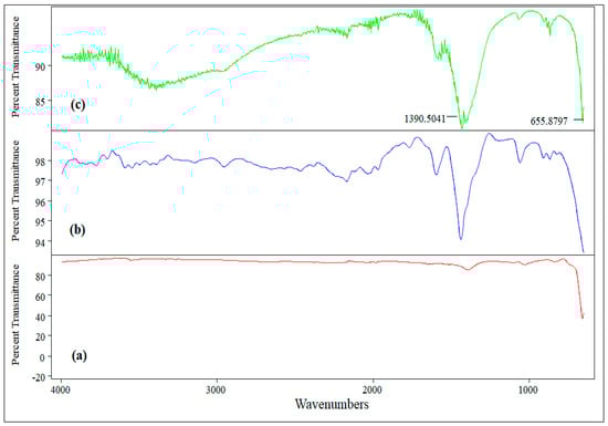 The FTIR spectroscopy of the synthesized nanocomposites was performed to estimate the purity and confirm the formation of required nanocomposites. The FTIR spectra of the synthesized nanocomposites are presented in Figure 2. The FTIR spectrum of bismuth oxide (NC1) (Figure 2a) has only one peak which corresponds to a O-Bi-O bond. The FTIR spectrum of Ce0.2 Bi0.8 nanocomposite oxide (NC2) (Figure 2b) and Ce0.5Bi0.5 nanocomposite oxide (NC3) (Figure 2c) were almost identical, with a few variations. The peaks corresponding to O-Ce-O in the FTIR spectrum of NC3 (Figure 1c) were more intense than NC2 (Figure 1b). The stretching vibrations of the asymmetric O-Ce-O bond overlapped with that of the O-Bi-O bond at 655.8797 cm−1. The peak that appeared at 1390.50 cm−1 in both NC2 and NC3 (absent in the NC1) might be due to the N-O stretching band of nitrates or the vibrations of the carbonate-like species formed through adsorption of carbon dioxide by the cerium oxide nanoparticles. Furthermore, the peak for the O-H bond vibration, clearly visible in NC3 (Figure 2c), might be due to unreacted sodium hydroxide or moisture absorbed by the NCs [,].