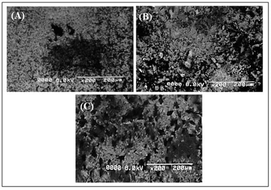 SEM images of (A) bismuth oxide Bi2O3 (NC1), (B) Ce0.2Bi0.8 nanocomposite oxide (NC2), (C) Ce0.5Bi0.5 nanocomposite oxide (NC3).