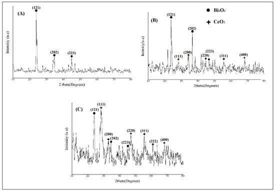 XRD patterns of pure Bi2O3 and COBO nanocomposites are presented in Figure 4. The XRD pattern of pure Bi2O3 (Figure 4a) is in concurrence with the standard value of Bi2O3 (JCPDS No. 27-0052). The peaks obtained in the XRD plot of bismuth oxide correspond to the miller indices (121), (202), and (223). The XRD plot for the Ce0.2Bi0.8 nanocomposite oxide (NC2) is shown in Figure 4b. The appearance of peaks at 28.5, 32.75, 45.3, 55.95 60.55 and 68.5 correspond to miller indices (111), (200), (220), (311), (222), and (400) for CeO2 (JCPDS card no.43-1002). The XRD pattern for Bi0.5Ce0.5 nanocomposite oxide (NC3) as presented in Figure 4c reveals that the XRD peaks for both NC3 and NC2 coincide and appear at almost similar positions; however, the peaks corresponding to CeO2 exhibited higher intensity. The higher intensity of the peak corresponding to cerium oxide might be due to the high crystallinity or high content of the cerium oxide. The increase in the peak intensity with increased cerium concentration has already been reported by other researchers [,]. Moreover, the broadening of the peaks by increasing the cerium amount suggests reduction in the size of the nanocomposites. The size reduction might be helpful in gaining a better Brownian movement and ultimately, a better enzyme activity [].