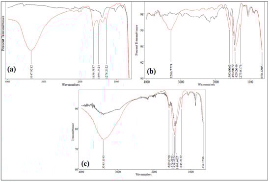 Evidence for the attachment of PDA to the surface of the metal oxide nanoparticles was obtained from the FTIR spectra of the bare and functionalized nanocomposites. The FTIR spectrum of bare NC1 (bismuth oxide nanoparticles) and NC1 coated with PDA is presented in Figure 5a. Four distinct peaks were observed in the spectrum of the surface modified NC2 nanoparticles. The absorption band at 3347 cm−1 was due to stretching vibrations of O-H and N–H groups in PDA. Furthermore, the sharp peaks at 1636 cm−1, 1494 cm−1, and 1278 cm−1 are attributed to the C=O, C=C, and C–O bonds, respectively, present in PDA. The presence of these peaks in the FTIR spectra of our nanocomposites serves as verification for the PDA attachment to the nanoparticle surface. The findings obtained here confirm previously reported results [].