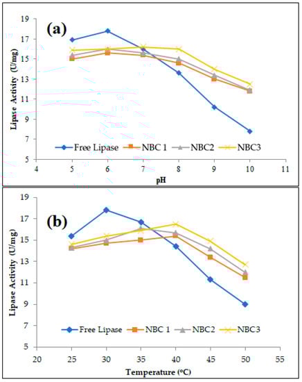 The effect of temperature on the performance of the free and immobilized A. niger lipases was studied in the temperature range 25–50 °C (Figure 6b). The optimum activity of the free lipase was 30 °C. The immobilized NBC lipases displayed higher optimum temperature of 35 °C (NBC2) and 40 °C (NBC1 and NBC3). As observed with pH (Figure 6a), the immobilized enzymes possessed higher stability towards temperature variations as compared to the free enzyme. The maximum lipase activities for NBC1 and NBC3 were 15.4 U/mg and 16.5 U/mg, respectively. At 50 °C, NBC3 retained 76% of its maximal activity. Immobilized enzymes are known to withstand harsh environmental conditions which proves beneficial in applications such as biodiesel production where low reaction temperatures can increase feedstock’s viscosity thereby resulting in decreased reaction rates []. Hence, the use of immobilized lipase with improved temperature stability would maintain a higher biodiesel production rate.