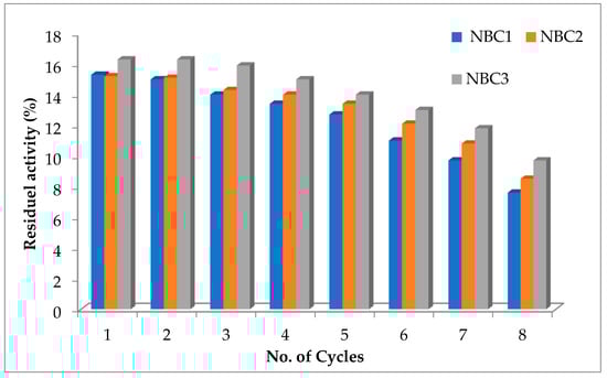 The NBC lipases were examined for their reusability potential in transesterification of E. sativa oil to biodiesel at their respective pH and temperature optima (Figure 7). The NBCs were recycled eight times, their residual activities were measured after each cycle, and results were compared. Best results were obtained with NBC3 which retained 59% of its initial activity after eight repeated uses. This might be due to the higher concentrations of cerium in the nanobiocomposite that is known to have a high oxidative potential to bind and hold compounds like PDA and lipase to the surface []. The high content of cerium oxide in the NCs leads to entrapment of oxygen in the NC crystals as well as adsorption of oxygen on the NC surface. This results in better oxidative properties []. The polymerization of dopamine is facilitated on oxidative surfaces, such as NC3 [].
