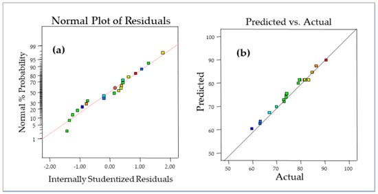 The validity of the quadratic model was also verified from the normality plot of residuals and predicted vs. actual plot (Figure 8). The normal data distribution points in normality plot without any strong outliers is indicative of the suitability of the quadratic model. Moreover, the similar predicted and actual values also supports the validity of the quadratic model for biodiesel yield data [].