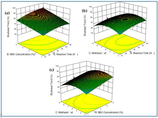 Response surface plots for significant interaction terms: (a) mutual effects of NBC3 concentration and reaction time on biodiesel yield, (b) mutual effects of reaction time and the methanol: oil ratio on biodiesel yield, (c) mutual effects of methanol: oil ratio and of NBC concentration on biodiesel yield.