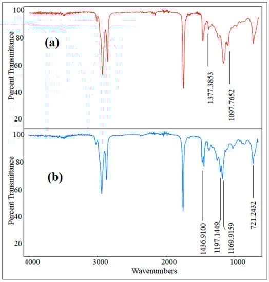 The biodiesel produced with the NBC3 biocatalyst was subjected to FTIR analysis to ascertain the formation of FAME. For the FTIR spectroscopic monitoring of biodiesel synthesis, the FTIR spectra of both the reactant (E. sativa oil) and the product (biodiesel) were analyzed in the 400–4000 cm−1 range (Figure 10). The appearance of new peaks at 1436 cm−1 and 1197 cm−1 in the FTIR of biodiesel (Figure 10b) confirms the formation of FAME. These peaks are indicative of the presence of FAME (1436 cm−1) and reflect the vibrations of the C-O bond (1197 cm−1) in FAME [].