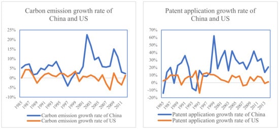 Research on the four common air pollutants shows that between 1972 and 2002, the real value of manufacturing output increased by 70% while the air pollution released by manufacturers reduced by 60% in the United States [6]. The decline in manufacturing pollution was predominantly due to technological innovation, while a small share of the decline comes from changes in the composition of the manufacturing industry. This raises the question: Do technological progress and changes in the composition of the manufacturing industry reduce pollution in other countries? This study compares the growth rates of technological progress, which is measured by the number of residents’ patent applications over the years and carbon emissions between China and the United States using the data from the World Development Indicators (WDI) database in Figure 1.