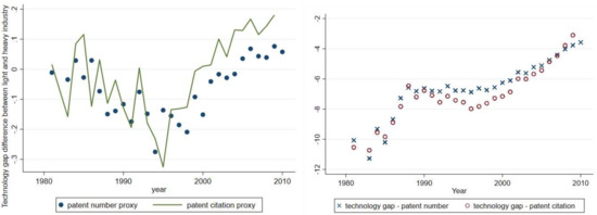 To make a clearer comparison of the technological gap between light and heavy industries, this study depicts the values of the technological gap and the difference in technology gaps in Figure 2. The left part of Figure 2 shows the trend of technological gaps over time in terms of patent quantity and quality in various industries in China from 1982 to 2010. The trends of the two indicators were relatively consistent. It can be seen from the figure that the gap between China’s technological level and technological-frontier countries rapidly narrowed from 1982 to 1990; however, it experienced a relatively gradual decline from 1990 to 1995 and continued to shrink rapidly from 1995 to 2010.