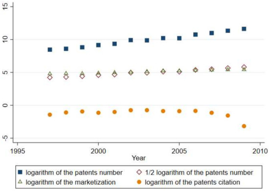 The number of patents approved does not comprehensively reflect the technical level of a particular industry. For example, the number of patents approved in industry i is larger than that approved in industry j, but this does not mean that the technical level of industry i is higher than that of industry j. The number of patent citations reflects the influence of patents, which can better capture the total quality and market value of patents [35,36,37]. Therefore, this study used patent citation numbers as another proxy indicator of the industry’s technical variables.
