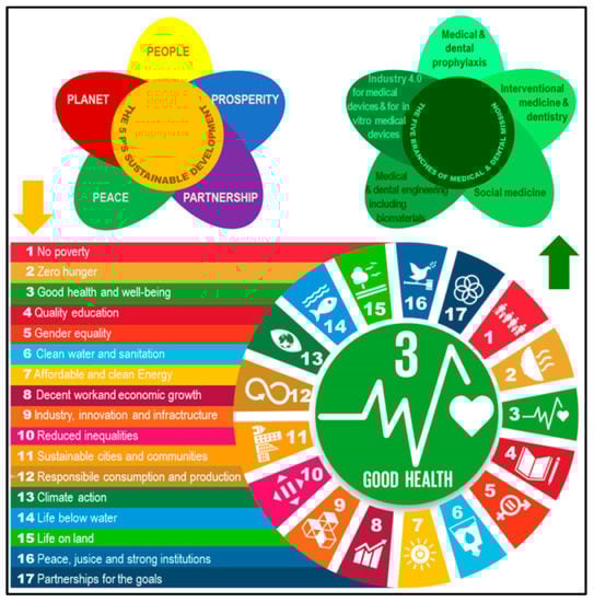 Diagram of five general assumptions of sustainable humanity development at the present stage with the resulting seventeen Sustainable Development Goals established by the United Nations and the resulting five branches of the medical and dental mission.