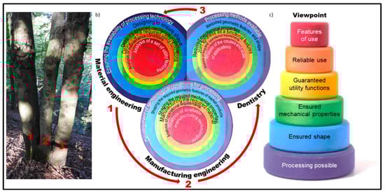 An example of beech with a triangularly branched trunk in Roztocze National Park in Poland (a) with synergy diagrams of materials engineering, manufacturing engineering, and dentistry (b) and a hierarchical arrangement of the main analyzed issues concerning filling materials used in endodontics (c).
