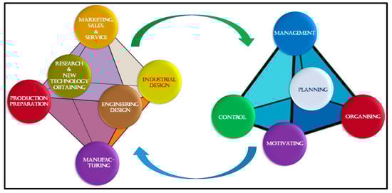 Figure 4 shows a general model of manufacturing engineering in the form of an octahedron, resulting from market activities, combining both marketing activities and market insight, as well as target distribution, promotion, and sale of manufactured products and their servicing, as well as market research to improve the current product [,,,].