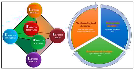The utility functions of the products expected by the customer will be ensured if the expected engineering material is used for their production and processed with the use of technology of the expected quality, in order to obtain the expected shape of the final product with the expected structure and expected mechanical and functional properties that provide these functional features of a product [,,,]. From the point of view of engineering practice, the most important task is, therefore, to design and manufacture products with all expected utility values and functional properties required for technical reasons. Modern engineering design is a complex, comprehensive process that includes closely related and mutually complementary areas of activity: material design, structural design of product forms, and technological design of product manufacturing, in a wide range including, among others, material process technologies (Figure 5).