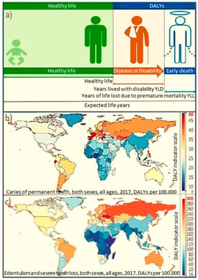 The result of caries and other periodontal diseases is removing single teeth and often complete toothlessness. Although tooth extraction, which is often not avoidable, allows for immediate problem resolution, it inevitably leads to the cessation of efficient functioning and the imbalance of the stomatognathic system. Dental cavities, which determine the number of closure pairs and affect the position of the remaining teeth, have a significant impact on the oral health-related quality of life (OHRQoL) []. Both oral diseases and partial, and especially complete, toothlessness cause an obvious loss of aesthetic value. More importantly, they cause the risk of numerous serious systemic complications and sometimes even cause a direct loss of life [,,,,,]. The development of oral diseases, in particular caries, and the resulting toothlessness has a significant impact on the disability-adjusted life years (DALY) indicator (Figure 6) [].