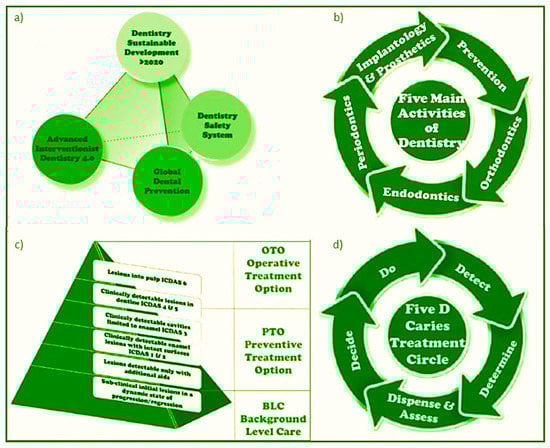 Models relating to dentistry: (a) sustainable development of dentistry; (b) the rules of the five main activities of dentistry (5MAD); (c) caries development pyramid (CDP) with indications from primary care (BLC) to preventive treatment options (PTO) and surgical treatment options (OTO); (d) 5D caries management cycle (CMCRs) principles for continuous improvement of the patient’s oral health.