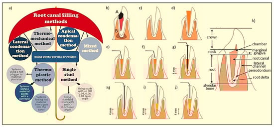 Scheme of root canal obturation methods in endodontics: (a) classification of methods in the form of an umbrella; (b) dead pulp due to a carious lesion (A) with a periapical lesion (B); (c) evacuation of the ventricular root pulp and conical root canal preparation; (d) fitting the main cone to the root canal; (e) cutting off the main stud with a heated plugger; (f) condensation at the mouth of the severed main cone with a cold Buchanan plugger; (g) plasticizing the main stud by introducing the heated plugger to a depth 4 mm less than the working length and cutting off the excess stud; (h) condensation of the plasticized main cone with a cold Buchanan plugger; (i) filling 1/3 of the central part of the channel with liquid filling material plasticized outside the channel and then condensing the material with a cold Buchanan plugger as in (h); (j) final filling of the channel with liquid filling material plasticized outside the channel and then condensation of the material with a cold Buchanan plugger as in point (h); (k) the functions of the tooth pulp before the onset of caries symptoms.