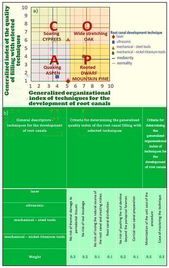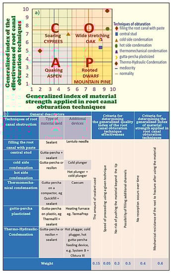 Depending on the value of the generalized potential and the level of generalized attractiveness, which were determined within the expert assessment [], each of the analyzed methods or modes was placed in one of the matrix quarters distinguished in the generalized dendrological matrix. Depending on the location of each of the analyzed methods or modes in a given quadrant, one can conclude about their market or methodological success, respectively, as in the discussed case concerning endodontics. Methods or modes with high generalized potential from the range (5.5; 10) and high generalized attractiveness from the field (5.5; 10) are located in the quarter of the wide-stretching oak. This can ensure the future success and expansion, for example, of the market expansion of particular methods and modes used in endodontics. There is no method of treating root canals in this quadrant, but there are four obturation methods, i.e., the Thermo-Hydraulic Condensation technique, hot side condensation, and the thermomechanical condensation gutta-percha plasticized method. In the quadrant dwarf rooted mountain pine, where the generalized potential is large in the range (5.5; 10), with limited generalized attractiveness in the field (1; 5.5), success is highly probable but subject to additional commitment to improving attractiveness. In this quadrant, there is a method of rotating machining using tools made of a Nitinol alloy, and in the area of obturation, the central stud method. There are methods or modes with high generalized attractiveness in the range (5.5; 10) in the soaring cypress quarter, but with limited generalized potential in the range (1; 5.5). Because, in such a case, the advantages are apparent and could obscure the real application possibilities, therefore success cannot be ruled out; although it is possible, it is not certain. In this quadrant, among the methods of root canal preparation, there is mechanical treatment with the use of steel tools, while in the field of obturation, there is the cold side condensation method. The quadrant quaking aspen, where both the generalized potential and generalized attractiveness are in the range (1; 5.5), indicates the weakest methods or modes that indicate the need to abandon their practical application, as they will not ensure success. The methods completely disqualified in root canal preparation include laser and ultrasonic treatment. In contrast, in the field of obturation methods, the use of pastes for filling root canals should be included. The results of virtual analyses [] obtained in this way indicate a limited range of possibilities for the development and obturation of root canals under practical conditions.