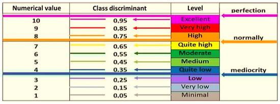 A ten-point unipolar positive interval scale without zero was used, where 10 is the maximum possible rating and 1 is the minimum rating (Figure 12). This universal scale of relative states has been used so far in many previous studies by the authors of this article [,,,,,,,,,,,,,,,,,,,,,,].