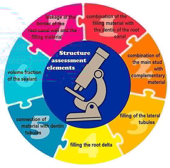 To assess the tightness of root canal filling using materials based on gutta-percha and resilon, attention was paid to seven elements of the research material evaluation depending on root canal preparation and obturation (Figure 15) [].