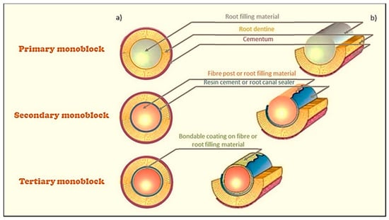 As experiments have shown, endodontics’ goal is only “asymptotic” and hypothetic to produce a monoblock as a solid, bonded, continuous dentin material from one root canal wall to another, usually mechanically forming a homogeneous unit with the root dentin []. A strong connection of the monoblock elements with the reinforcing material is required, and the modulus of elasticity of the monoblock and this material should have similar values []. There are three types of monoblocks depending on the number of interfaces between the bulk material core and the binding substrate. The primary monoblock shows a single interface between the material and the root canal wall, as in the case of Hydron [], MTA mineral trioxide aggregate [,], bio-gutta, and polyethene fiber core systems []. The secondary monoblock has two points of contact, between the core material and the cement, and the other between the cement and dentin, as in the case of gutta-percha-based filling materials due to the presence of a sealant [], despite a too low modulus of elasticity [,,], and adhesives as substitutes for gutta-percha [], as well as resilon with a methacrylate-based sealant, although strong polymerization shrinkage causes leaks [] and makes the monoblock’s existence impossible. Tertiary monoblocks have a third boundary between the filler material and the bonding medium such as EndoRez or resin-coated gutta-percha with CLEARFIL LINER BOND 2V binder [,] or using ActiV GP [,]. It was generally shown in [,] that the monoblock concept is not true, despite its stable position in the literature. Schematically, the monoblock concept is presented in Figure 14.
