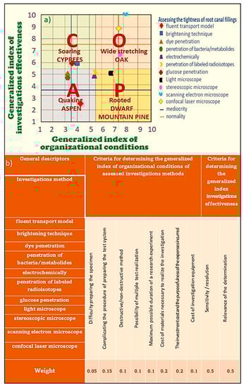 The choice of the appropriate method for assessing tightness and the other aspects mentioned above in evaluating the research material are depending on the variants of development and obturation of the root canal. In work [], an analysis of the weighted scoring method was carried out with the development of the “meteorologi-cal” contextual attractiveness matrix, which showed that among the methods of as-sessing tightness of root canal fillings, the highest values and a clear advantage over other methods in terms of effectiveness were given to visualization methods using materialographic microscopes (Figure 10).