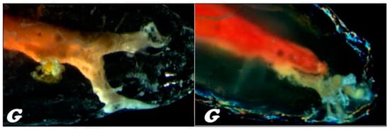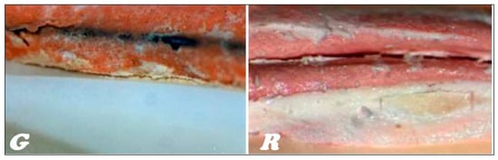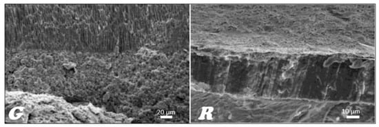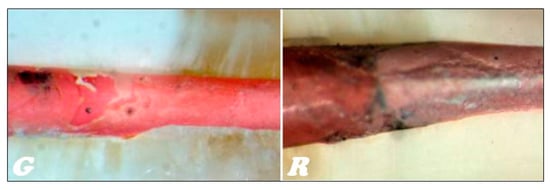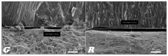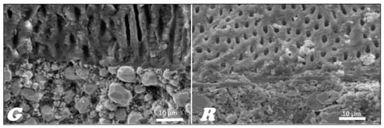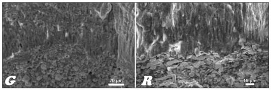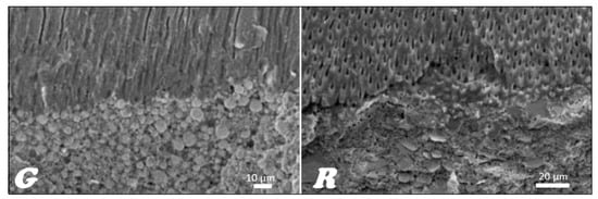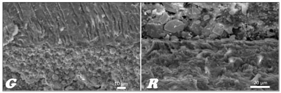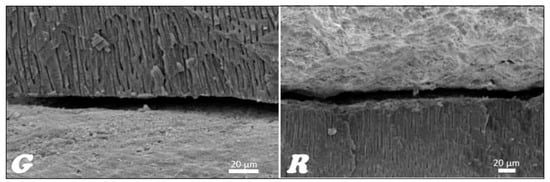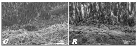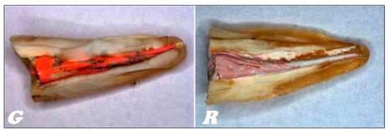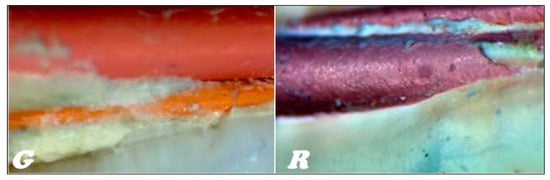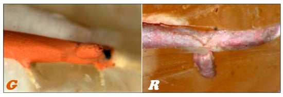 In the stereoscopic light microscope, preliminary studies of the longitudinal fractures of the teeth filled with material based on gutta-percha (Figure 16G) and resilon (Figure 16R), respectively, were carried out, indicating that the root canal is tightly filled by the main stud connected to the root canal dentin with a relatively thick- or thin-layer intermediate sealant.