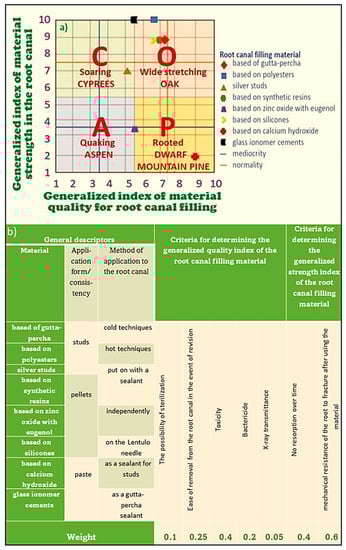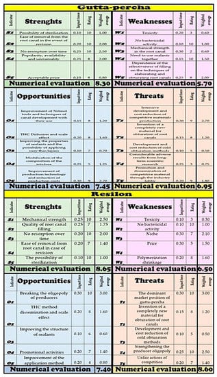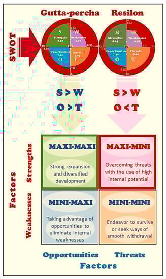 The results of the SWOT point analysis (strengths and weaknesses, opportunities, threats) were also compared, according to the previously described methodology and the results of analyzes contained in the works [,], each time defining five key fac-tors relating to each aspect in this analysis, adequate to both analyzed filling materials. A contextual dendrological matrix, taken from the work [] on endodontic filling materials, is also presented. The generalized dendrological matrix of filling materials used in endodontics is presented in the coordinate system generalized potential show-ing the real objective value of a given material—generalized attractiveness of these materials for endodontic treatment.