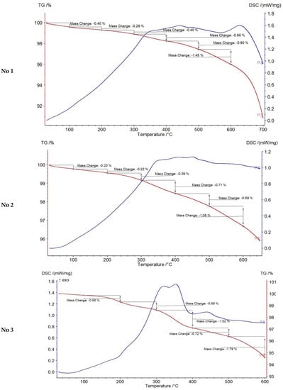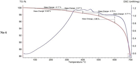 In order to determine the content of non-extractable organic matter in the composition of the oil-containing rock and the effect of the microwave field in the presence of catalyst on the possible additional generation of coke-like substances like carbene-carboids (compaction products during asphaltene conversion reactions), thermogravimetric study of rock samples after oil extraction was carried out. Weight loss during thermal analysis of the extracted rock samples is presented in Table 6 and the obtained general thermograms are presented by Figure 3 and Figure 4.