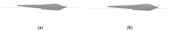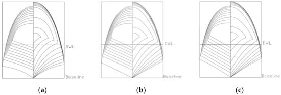 Initial float with different deadrise angle: (a) Deadrise angle at 20 degrees; (b) Deadrise angle at 25 degrees; and (c) Deadrise angle at 30 degrees.