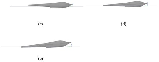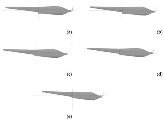 The discussion [18] concluded that the total resistance value obtained during trim by stern decreased before increasing afterward. This is because each trim change that occurs will change the area and volume of the hull immersed in water and will affect the viscosity and wave resistance. The effect of trim changes is quite significant on the wave resistance, which ultimately affects the total resistance. The lowest total resistance value was achieved at the 0.02-meter value of the stern trim. In this study, the trim value for each float design was carried out to obtain variations in the data when it was simulated. The following is the design of the float with variations of stern trim (Figure 2) and bow trim (Figure 3) with values of 0.44, 0.88, 1.32, 1.76, and 2.2 degrees.