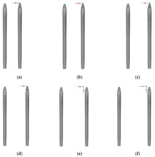 Initial float clearance configuration: (a) 0.20; (b) 0.25; (c) 0.30; (d) 0.35; (e) 0.40; and (f) 0.45.