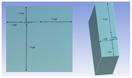The location of boundary conditions is defined both in the area around the object and the flow to determine the grid’s size (mesh). Based on the grid independence test, at sizing 0.2, the maximum velocity value is 4.97 m/s. Then the maximum velocity value tends to be constant. Based on this, the value of 0.20 can be chosen as the sizing for future simulations. Before the numerical simulation, domain creation was designed. The domain is in the form of a box with formal boundaries that are adjusted to ITTC provisions. The boundary location in question can be seen in Table 3 and Figure 6 for the computational domain of the applied velocity condition, and free surfaces.