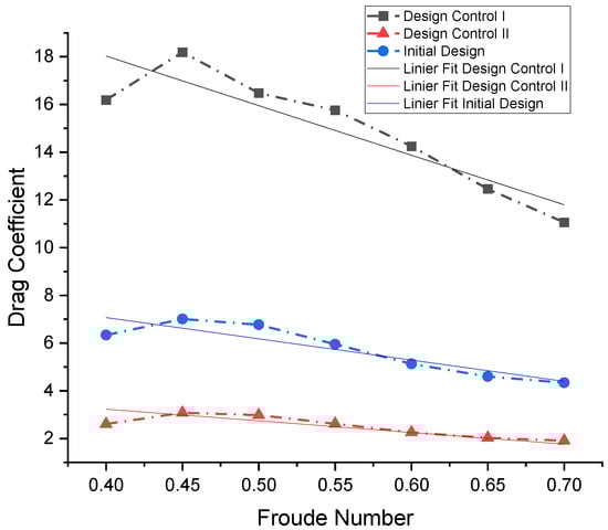 Coefficient drag vs. Froude number of the design model (design control I, design control II, and initial design).