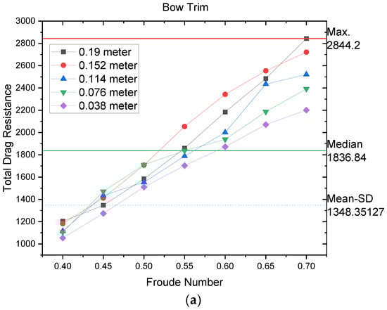 Total drag vs. Froude number of the trim variation on the initial design for bow trim (a) and stern trim (b).
