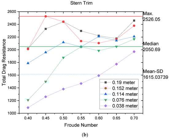Then, it can be seen in the graph that the trim by stern value for the total resistance value (Rt) continues to increase at the even keel and trim of 0.038 m. However, at the trim value of 0.076 m at Fn 0.6, RT decreased by 62.5 N before rising again to Fn 0.7. The same thing happens in the next trim, where a certain Fn will experience a decrease before increasing again to Fn 0.7. According to Fenster et al. [12], it occurs due to changes in the value of wave and viscosity resistance by increasing the trim and ship speed. The lowest average total resistance value (RT) is found in the trim value of 0.038 m trim by the stern of 1500.004 N.