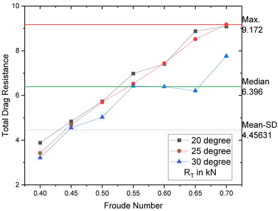 Meanwhile, the 25° deadrise angle variation resistance is not much different from the 20° deadrise angle variation, and the increase in resistance tends to be stable. In the Froude number range 0.7–0.9, both models significantly differ in total resistance compared to conventional designs, which have a more considerable resistance value. The resistance ratio from the graph above shows a relatively significant difference in resistance. The 30° deadrise angle design seems to have a much smaller resistance than the conventional design. The increase in resistance at the 30° deadrise angle also looks stable. It can be seen that the design of the fish body with a 30° deadrise angle has a much smaller resistance compared to the conventional design at high speed, namely, the Froude number 0.9 has a difference in resistance of RT = 6.448 kN.