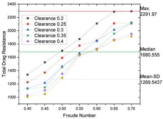 The following equation is IF (Interference Factor), represent the total resistance coefficient of two hull, and represent the total resistance coefficient of one hull. This effect can be seen where the closer the adjacent floats, the more drag it produced. The clearance between float is represented in Figure 5 by the procedure recommended by other studies [22,23,24].