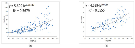 where e is the index (natural exponential function) 2.71828; a and b are unknown parameters; x is the independent variable; and Y is the strain number, which is the predicted result. The method is the same as per the literature [31]. The data used to derive the model and evaluate the result are collected from recruited volunteers. These volunteers are young students. The average age of male subjects was in the range of 20–39 years, weighing 53–76 Kg, and height in the range of 161–181 cm. Most of them have exercise habits and their weekly exercise time is between 10 and 120 min. The average age of female subjects was in the range of 20–38 years, weighing 43–72 Kg, and height in the range of 152–175 cm. Among the population, three girls do not exercise regularly, whereas the others have exercise habits. Their weekly exercise time is 30–120 min. The heart rate and ventilation amount of 29 subjects were used to establish a predictive model, among which 15 were males and 14 were females. The result is shown in Figure 1a,b, respectively.