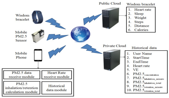 Next, the system architecture and the operations are introduced in this section. The system exploits hybrid cloud-based deployment [35], as shown in Figure 2. The client APP in the mobile phone serves as the Collaboration Agents [35] to integrate the public cloud and private cloud and is mainly divided into four modules: PM2.5 concentration data receiving module, heart rate data acquisition module, PM2.5 inhalation calculation module, and historical data module. In addition to the smart bracelet, MPS, and the APP deployed in mobile phones on the front-end, the back-end system uses a hybrid cloud architecture too to deploy the proposed system. The public cloud collects and stores heart rate-related data, whereas the private cloud collects and stores the data regarding PM2.5 and the user’s personal information.