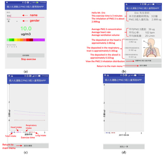 In this study, an APP was implemented through the Proof-Of-Concept method to present the results. This APP can collect different types of data from the user and present the result. Since this APP is targeted at Taiwanese people, the interface contains traditional Chinese elements, and red fonts are used to present the translated text. When a user starts exercising, the APP will show their current PM2.5 value and other data, when starting to record exercise, as shown in Figure 3a.